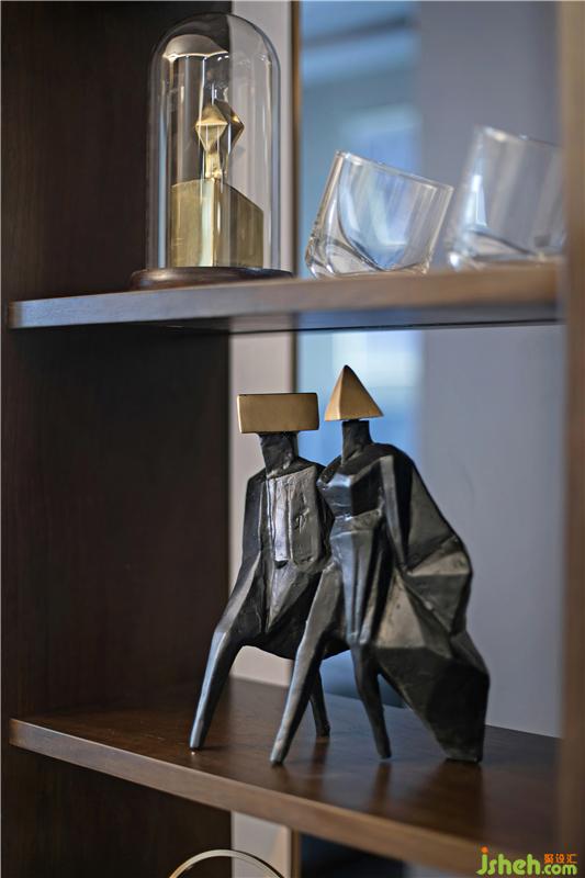 大理石電視背景墻的冷硬與抽象的藝術裝置相互映襯,在克制中跳脫出不凡的藝術嗅覺。樣板房設計