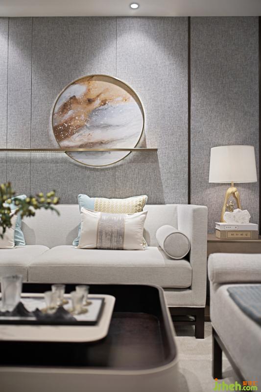 『天圓地方』是中國文化中非常重要的理念,而沙發(fā)背景墻的圓形一體化藝術(shù)裝置將這一理念表現(xiàn)得淋漓盡致,方中見圓,圓中帶方。樣板房設(shè)計