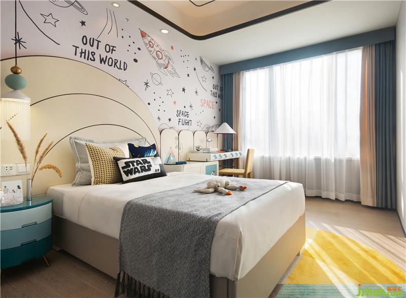 設(shè)計師用空間為男孩造了一個太空夢,視覺上采用色彩變化、裝飾轉(zhuǎn)換,桌椅造型等方式,讓每個區(qū)域獨立而不孤立。樣板房設(shè)計