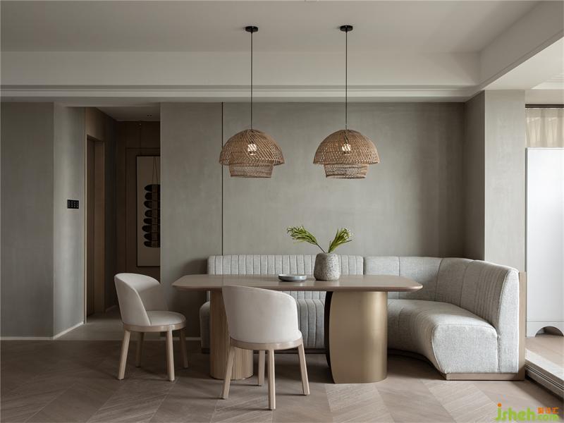 在客廳一隅,竹編的鳥籠吊燈,展現(xiàn)出手工藝的趣致,簡(jiǎn)單的自然元素,質(zhì)樸溫潤,微水泥墻面的剛性與半圍合沙發(fā)的柔性,散發(fā)出耐人尋味的溫度,讓身處繁華都市的人們,產(chǎn)生對(duì)侘寂生活的向往,都市侘寂風(fēng),傳達(dá)美的方式--婉約著直達(dá)內(nèi)心。