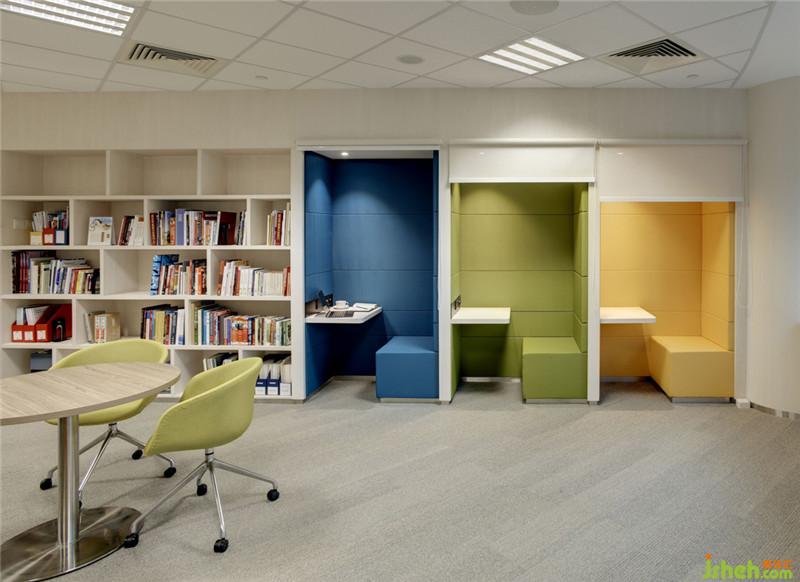 設(shè)置了三個(gè)半封閉式區(qū)域供員工辦公或休息使用。室內(nèi)設(shè)計(jì)師