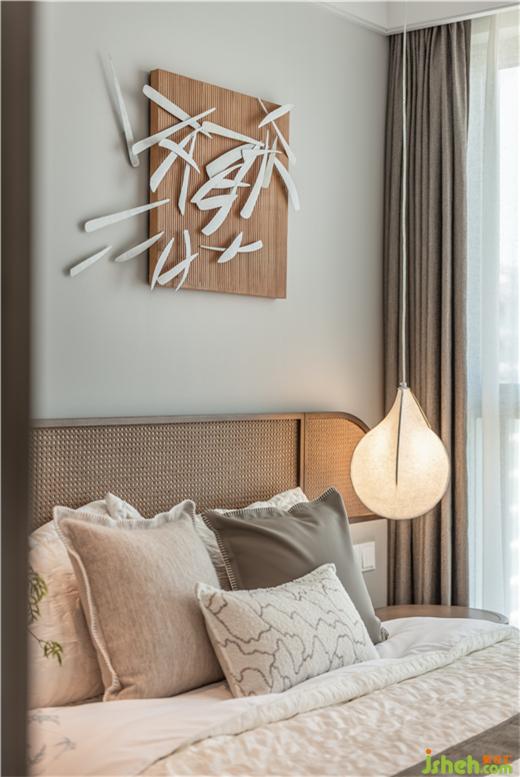 植物元素遍布整個樣板房,窗簾“金葉環(huán)繞”,地毯如陽光下的斑駁樹影,床毯以大鵬七娘山“七仙女”為靈感元素嵌入,酒店公寓設計整體空間將大鵬的傳承過往一一呈現(xiàn)。