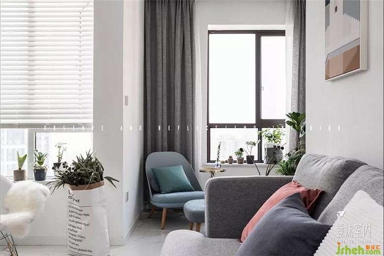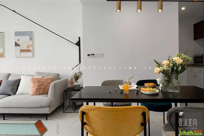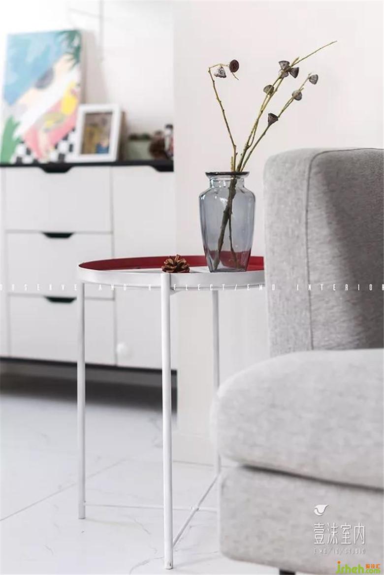 客廳里面小房間的墻體被打掉之后跟客廳連在一起形成公共區(qū)域,增加了客廳的使用面積同時也使客廳的空間更加開闊、明亮??蛷d的墻面以白色為主通過光線的反射來增加空間的采光,軟裝以灰白色作為基調(diào)局部點綴紅色、藍(lán)色以此來活躍空間的氣氛。