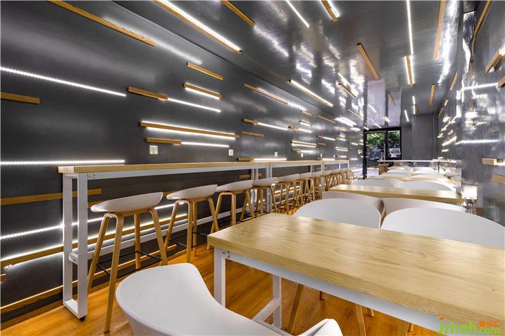 因此,如何利用狹窄的過道式空間打造“設(shè)計爆款”的就餐空間就成為了本次設(shè)計的核心問題,同時極低的造價預(yù)算同樣也是需要克服的設(shè)計障礙。另外,結(jié)合環(huán)境現(xiàn)狀,有三個設(shè)計要點可以明確:第一,需要合理利用好這個空間窄長的形式特征,依次排布桌椅,體現(xiàn)出空間特質(zhì);第二,通過設(shè)計材質(zhì)貼面等盡可能使店內(nèi)看起來寬敞不壓抑;第三,注重外立面的設(shè)計,造成一定的視覺沖擊,吸引來往行人入內(nèi)就餐。而狹小的空間必須考慮到人群流量的控制,因此需要通過空間創(chuàng)造出的“快速”的心理映射。