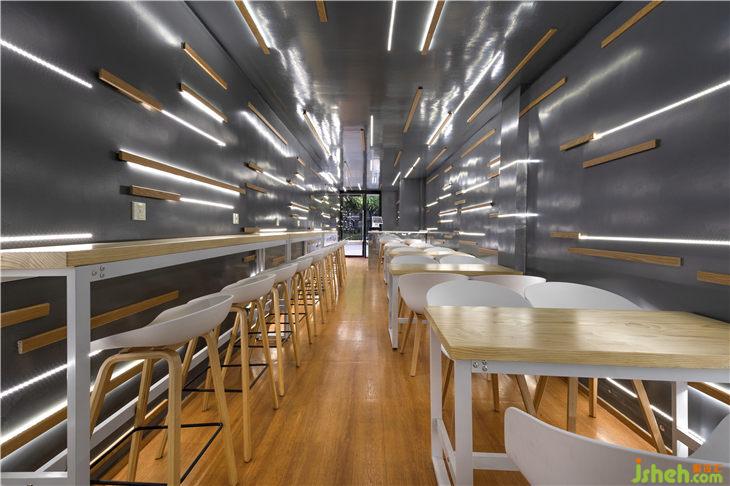 但為滿足較為良好的用餐體驗,并且增加空間的橫向?qū)挾?,使之又不至于太過深邃壓抑。在經(jīng)費有限的條件下,設(shè)計師摒棄使用鏡面材質(zhì)而嘗試用在墻面上涂刷價格較為低廉的環(huán)氧樹脂漆創(chuàng)造反射與發(fā)光感的空間界面,漫反射帶來類似磨砂的質(zhì)感又不至于使光線反射過于強烈而引起不適。同時在柜臺、廚房與就餐空間的分隔面等非墻面界面則使用鏡面亞克力使空間形成一個鏡面反射的整體同時增強空間的縱深感??臻g界面之間的界限模糊,很好地增加了空間的開闊性。