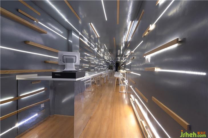 設(shè)計師在設(shè)計之前對菜品的品嘗以及與大廚的聊天中,逐漸形成了味覺時光隧道的設(shè)計概念:在圍合的墻面和頂面上均安裝水平的線條——為增加墻面的多樣豐富性和飛逝的效果。采用了木條和LED燈帶兩種材料的三種組合,在強調(diào)速度,促進一波又一波用餐者的更迭的同時,又強調(diào)出“隧道”極佳的延伸與進深感,以及光線為空間帶來的流動感和活力。