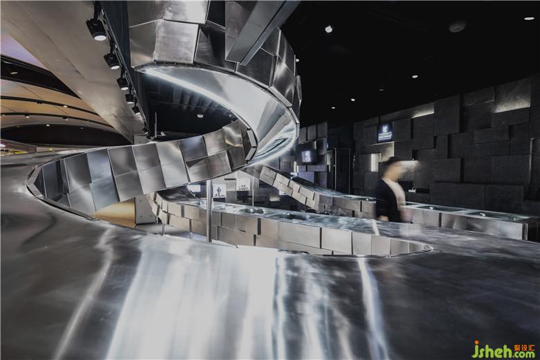 深灰色的幽暗背景,銀色的鉆石紐帶在空間中飛舞旋轉(zhuǎn),顧客自然的被紐帶所吸引著,進(jìn)入展陳空間,欣賞美好的珠寶設(shè)計(jì)作品。紐帶在不同高度自然的形成引入的拱門,平滑的展柜,舒適的顧客服務(wù)區(qū),以及最耀眼的螺旋塔冠。