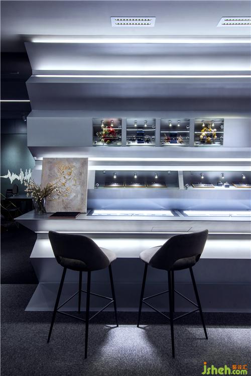 由不規(guī)則多邊形切割組成的收銀區(qū)中,延續(xù)整體空間的多面切割形態(tài),將平面語(yǔ)言翻折,隱藏傳統(tǒng)的收銀臺(tái),減小顧客對(duì)收銀區(qū)本能的回避。造型墻面與整體空間融為一體,臨近洽談休息區(qū),將收銀、維修、員工休息等功能集于空間敘事的盡端。