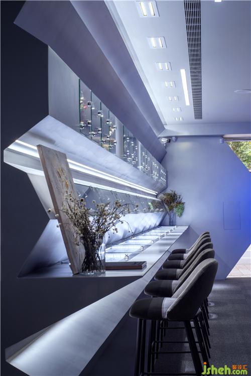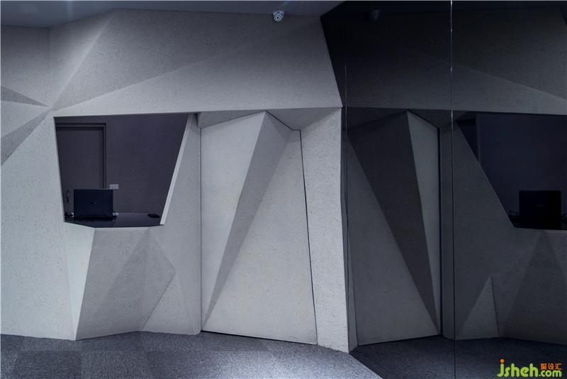 In the cashier area composed of irregular polygonal elements, the multi-faceted cutting form of the overall space is continued, the plane language is turned over, the traditional cashier is hidden, and customers instinctively avoid the cashier area. The modeling wall is integrated with the overall space, adjacent to the negotiation rest area, which integrates the functions of cash register, maintenance, and staff rest in the final space narrative.