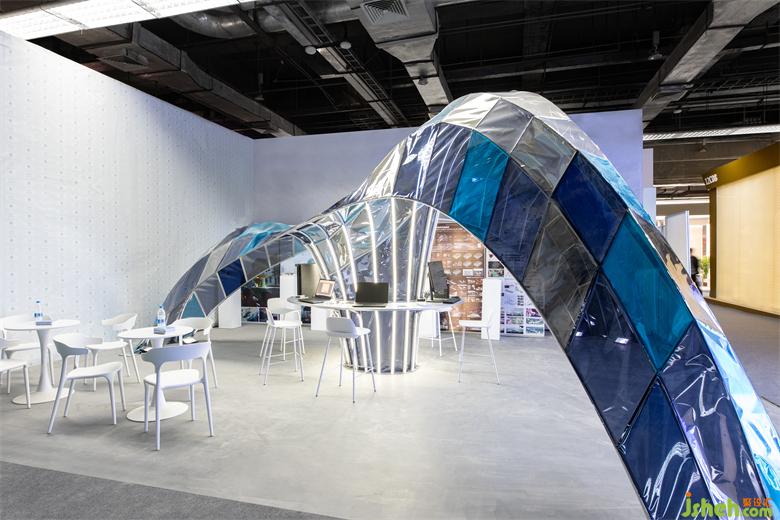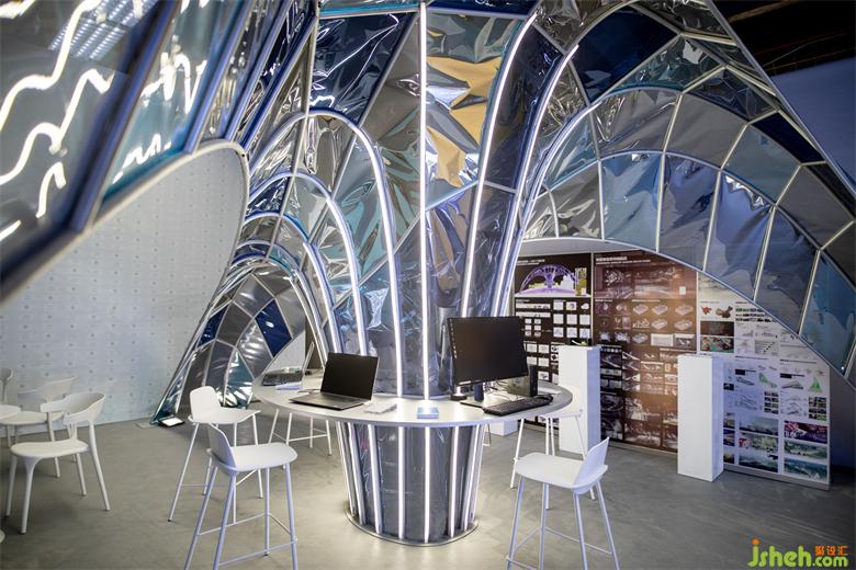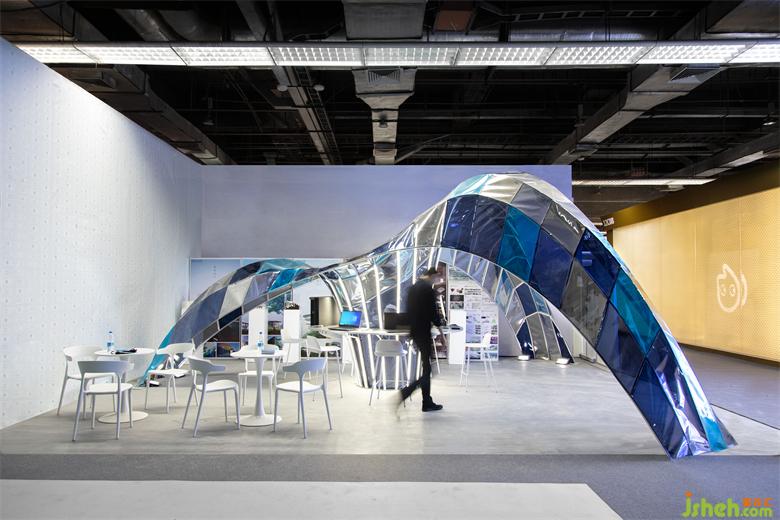 “超級設(shè)計創(chuàng)作營”作為戴爾在廣州設(shè)計周的主要產(chǎn)品展示中心設(shè)計,是承擔設(shè)計周期間戴爾的產(chǎn)品發(fā)布、文化沙龍等公共功能的展亭,我們希望顛覆傳統(tǒng)展廳的白盒子空間,打通空間的界限,創(chuàng)造一個流動與自由的空間。展廳的靈感來源于古老的拱形結(jié)構(gòu),使之經(jīng)過拉伸變換與組合,最終生成了漂浮的曲面拱結(jié)構(gòu)的形態(tài)。我們將歷史的建筑結(jié)構(gòu)元素通過一種當代的、科技與藝術(shù)相融合的設(shè)計手法來重新定義結(jié)構(gòu)形態(tài)的可能性,希望引發(fā)人們重新思考“科技與歷史”連接的可能性。