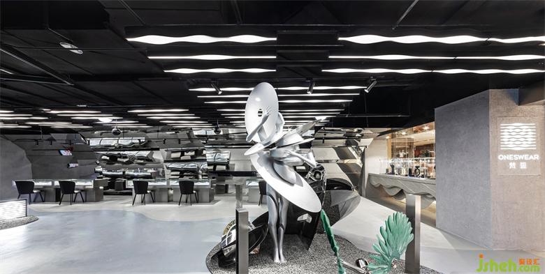 場地位于新天地商場二樓,一個扶梯上來最先看到的位置,整體呈L形。長立面直接對著走廊和扶梯,是最優(yōu)展示面,順利成章的設(shè)置為櫥窗和主入口;入口處中間的立柱包裹上環(huán)形LED屏幕,弱化了立柱對入口的隔斷,使多彩的動態(tài)廣告圖像成為視覺中心。短立面外是通往商場后勤方向的交通空間,設(shè)計上減少了展示功能,除了圍合接待區(qū)的墻面之外,其他立面區(qū)域開放與主入口相連,擴大了入口,引入顧客的視線和動線,更好的展示內(nèi)部空間和藝術(shù)裝置。店內(nèi)以藝術(shù)裝置為中心,周圍環(huán)繞著展柜和接待臺等功能區(qū),將品牌的先鋒氣質(zhì)和旗艦店的藝術(shù)主題凸顯出來。
