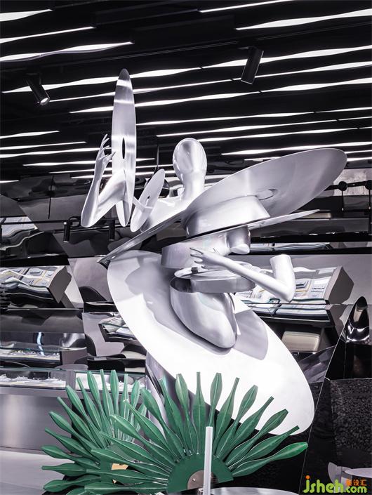 Visiting the exhibition area from the entrance all the way, display cabinetsare scattered on the wall and regular in the wall. They are like some square lenses displaying bright and beautiful jewelry.