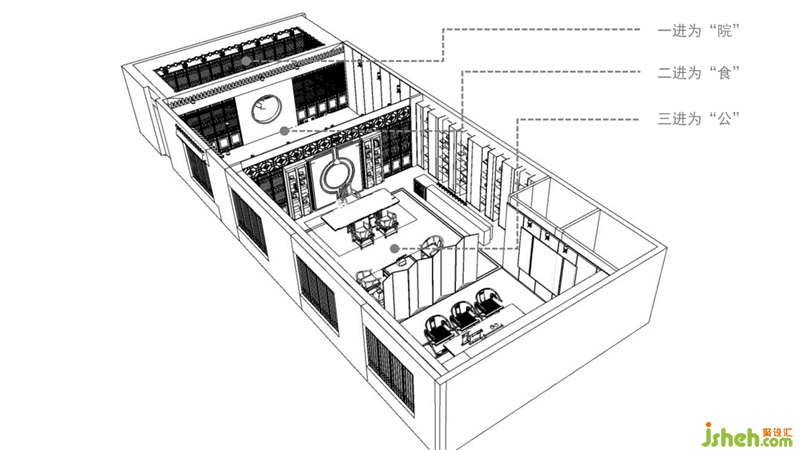 那么這個項目里,我們在一個室內(nèi)空間中營造了一個“狹義”的三進四合,一進為“院”,二進為“食”,三進為“公”。