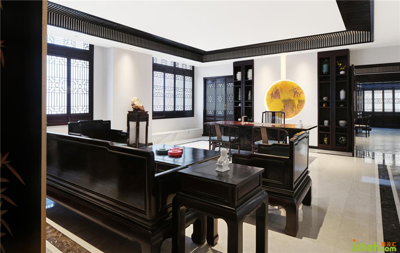 在第一進室內(nèi)空間,營造模擬的天井院落,綠植,流水,假窗等,遵循中國式的浪漫主義,即“誰道江南風景佳,移天縮地入君懷”,由“園”到“室”,這是中國人對于“天人合一”的一種追求。頂部發(fā)光的燈膜吊頂及墻面發(fā)光的玻璃窗,似乎這即是天光。