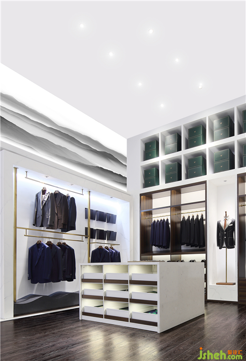 KING SATART高級(jí)成衣定制店,是我們所接觸的他們的第二個(gè)項(xiàng)目,位于河西金奧費(fèi)爾蒙酒店一層,因?yàn)橐恍┈F(xiàn)場(chǎng)條件的限制,這個(gè)項(xiàng)目是對(duì)原有空間的一個(gè)改造。現(xiàn)場(chǎng)層高4.6米,在不做頂部區(qū)域改動(dòng),并無(wú)法利用挑空做功能使用的情況下,南京店鋪裝修設(shè)計(jì)我們引用“忽聞海上有仙山,山在虛無(wú)縹渺間”的概念,把上部空間做成了發(fā)光的遠(yuǎn)山的形式,而空間的下部區(qū)域,以人的尺度最大滿足展示及儲(chǔ)藏需求。
