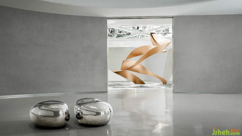 每個(gè)三角形的中空結(jié)構(gòu)的內(nèi)壁都是鏡面不銹鋼,形成一個(gè)空間萬花筒,通過光影的折射,畫卷、天空、室內(nèi)環(huán)境,共同形成了一個(gè)變化豐富的視覺亮點(diǎn)。