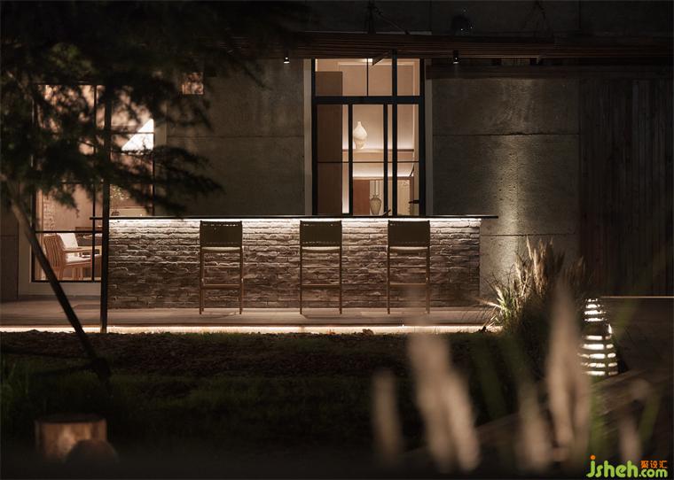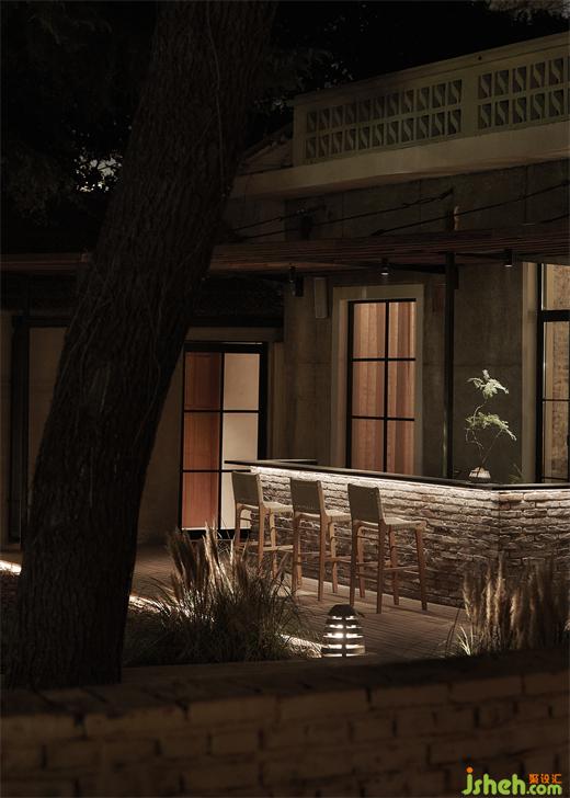 矮紅磚墻的設(shè)計(jì)增強(qiáng)了庭院的圍合感,使整個(gè)空間更具包容性。此外,設(shè)計(jì)師用松樹皮作為餐廳院子的鋪裝材料,其天然的質(zhì)感和顏色隨著日夜變遷不斷創(chuàng)造著自然之美。