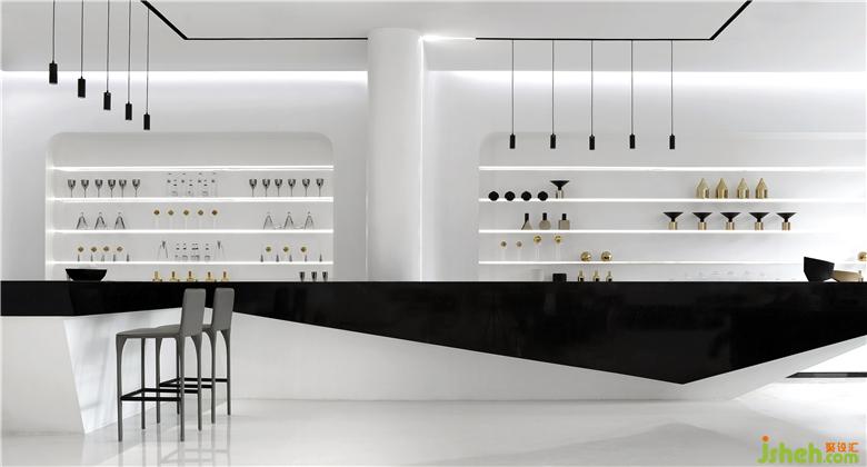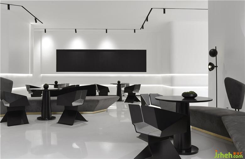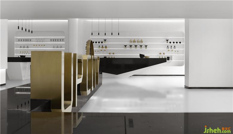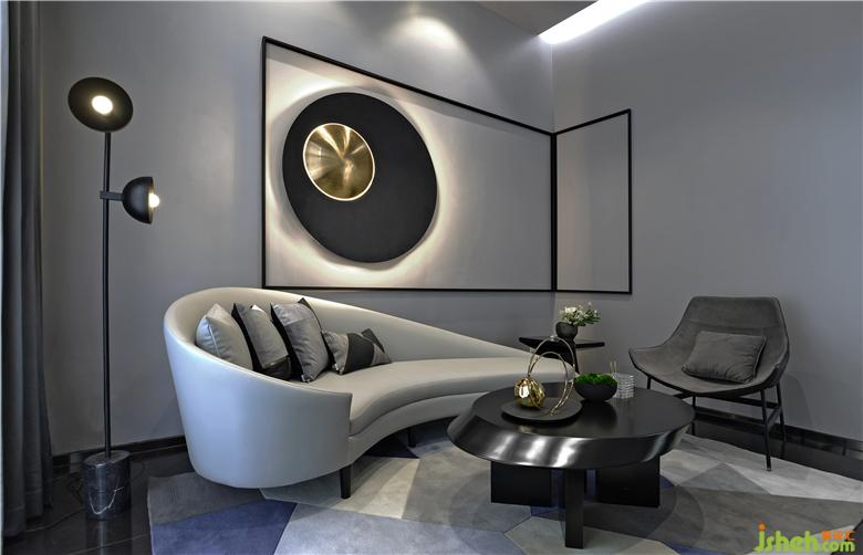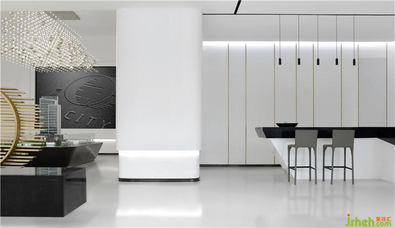 留白,源自于中國(guó)傳統(tǒng)繪畫(huà)的構(gòu)圖技巧,以無(wú)形繪有形。在黑與白之間,描刻出形與神的深邃意境,留予人無(wú)限的想象。被這一處白吸了眼,幾縷似水般的光帶,在空間中自由地游走,身影徘徊于明亮與陰影之中,不自覺(jué)的被頂面一道道搖曳的光所吸引著,引導(dǎo)訪客其中漫游,思考,流連。設(shè)計(jì)師拿捏著空間的尺度,通過(guò)對(duì)形體、色彩、質(zhì)感、軟裝來(lái)營(yíng)造一個(gè)頗具性格的藝術(shù)之域,用造型的變化替代多材料的裝飾手法。折線射燈與立面造型相結(jié)合,相應(yīng)可產(chǎn)生深淺變化,形成層次。作品在環(huán)境風(fēng)格上還是取用黑與白之間的對(duì)比,金色為點(diǎn)綴,克制與取舍往往才是走向無(wú)限的通幽之徑。售樓處設(shè)計(jì)