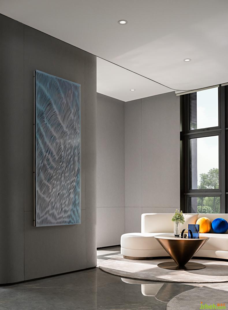 過道作為不同功能區(qū)的中轉(zhuǎn)點(diǎn),自出獨(dú)特的格調(diào)。走廊盡頭直觸圓形裝置,好像《桃花源記》中所描繪的“初極狹”,而后“豁然開朗”,令人沉浸于藝術(shù)與生活共融的美學(xué)場景,向往自在陶然的生活