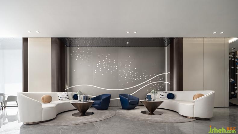 正如同宇宙星球,圓代表著無邊無界,象征著圓滿的寓意。售樓處設(shè)計(jì)運(yùn)用軟裝形態(tài)的圓融,形成了溫和的空間氛圍,背景墻透出璀璨星河的模樣,象征自然界的包容、共融性,治愈并給予著人們能量。