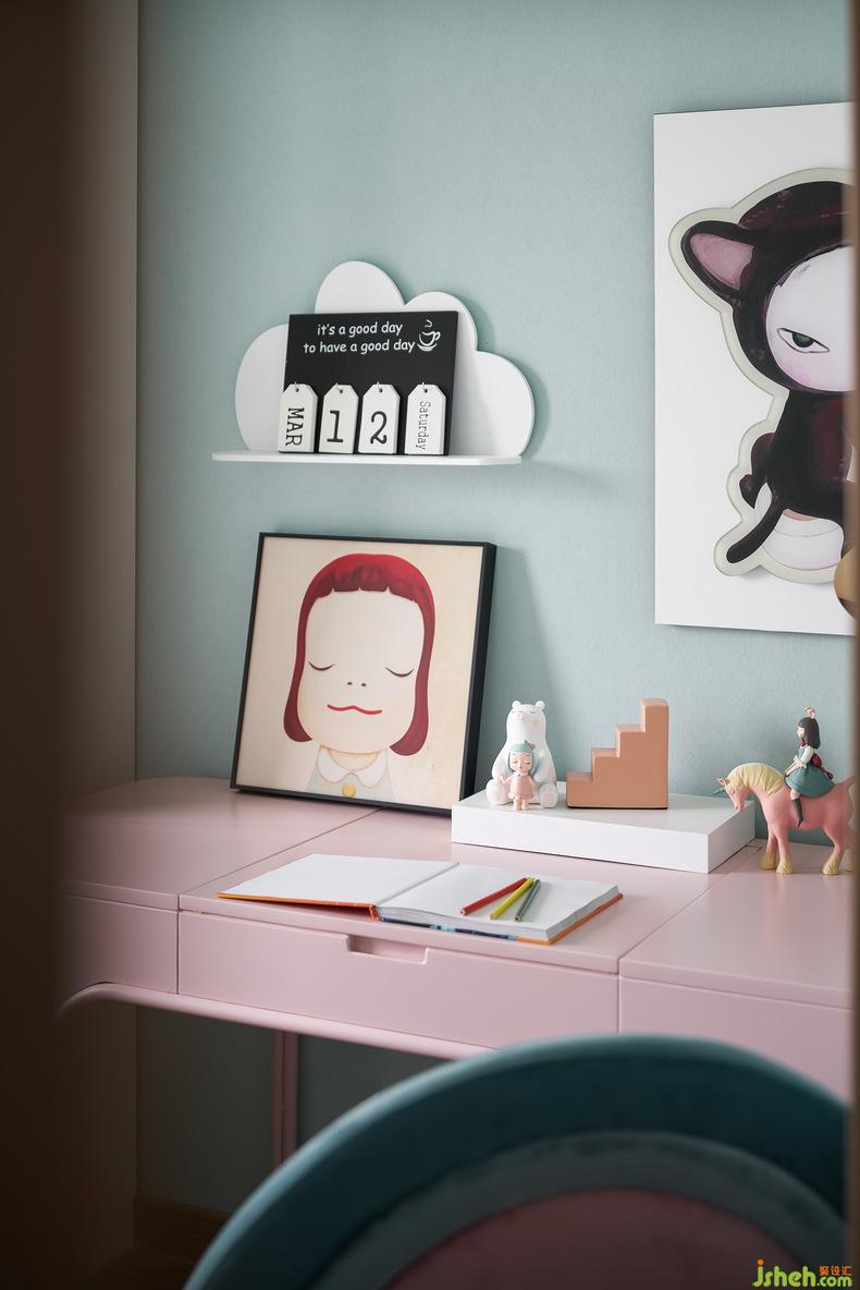 女孩房里,色彩運(yùn)用達(dá)到極致。藍(lán)色的墻體,粉色的衣柜與書(shū)桌,樣板間設(shè)計(jì)配以米色的床品,再加上書(shū)桌上的一副卡通人物畫(huà),集齊所有夢(mèng)幻的顏色、浪漫的形式。