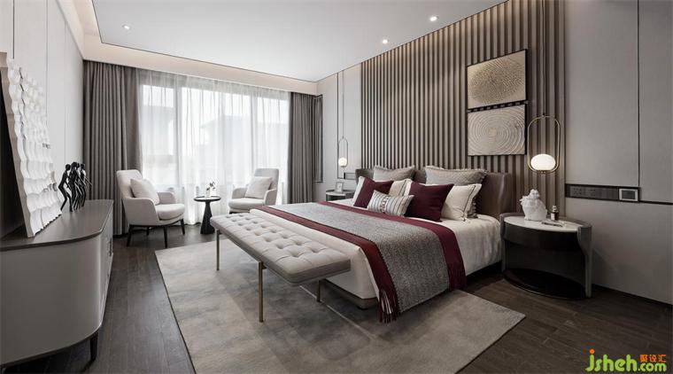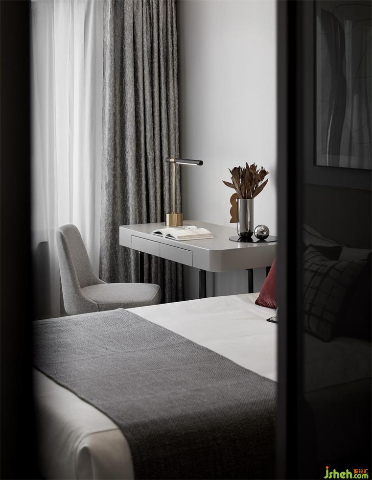 二層主臥克制守序,色調柔和,氛圍舒心,家具、樣板房設計用色和裝飾美學混用,不管窗外如何喧囂吵鬧、紅塵紛擾,你只想沉浸于此。它不僅是身體的停靠處,更是精神的棲息地。