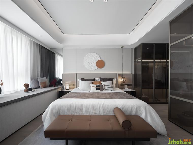 主臥以沉靜溫暖的色調(diào)營造寧靜柔和的空間氣質(zhì),煙波浩渺的海面冉冉升起一輪圓月,樣板間設(shè)計勾勒“月下休憩”的詩意。大面積飄窗延伸空間的更多可能,閱讀、發(fā)呆、靜靜欣賞窗外的風(fēng)景……多種美好在此發(fā)生。