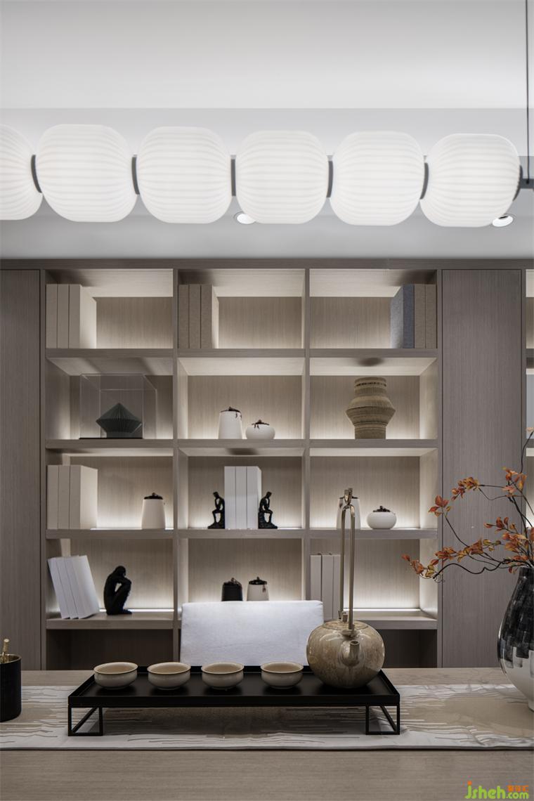 夾層書房,設(shè)計師特意選用木、瓷、紙等東方美學(xué)元素點綴空間,樣板間設(shè)計居者可在此靜心品茗賞味、恣意揮灑筆墨、或自在把弄古玩。沉浸式場景打造,賦予空間文人雅士般的氣質(zhì),靜享生活的淡泊與寧靜。