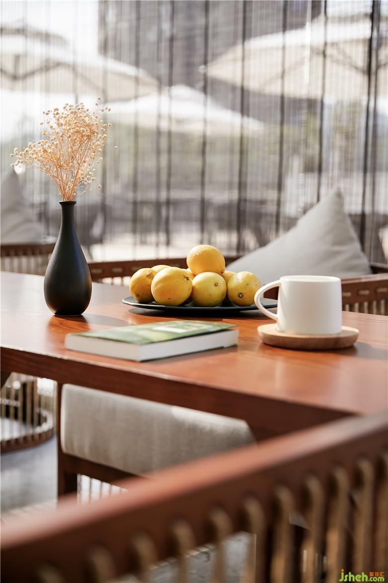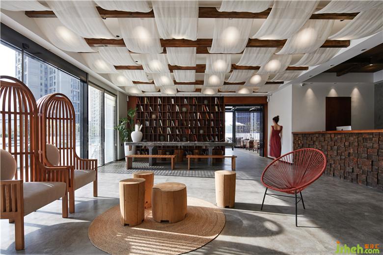 進(jìn)入酒店大堂,首先映入眼簾的是老木頭搭建而成的接待臺,頗具復(fù)古感。大堂的背景墻摒棄傳統(tǒng)酒店大堂的設(shè)計(jì)思路,意在追求返璞歸真、回歸自然。粗礦外露的石墻,棉麻木質(zhì)的沙發(fā),跳色的線椅,老木頭樹樁……將自然、質(zhì)樸的概念展示得淋漓盡致。室內(nèi)設(shè)計(jì)師與酒店創(chuàng)始人從開始交談這個項(xiàng)目時(shí)就想打造一個真正能讓人靜下來的居所。所以書是必不可少的,隨之滿墻的書架就直接充當(dāng)了一道亮麗的背景。酒店大堂的空間設(shè)計(jì)上,體現(xiàn)更多的是用原生質(zhì)樸的材料,刻畫空間、裝點(diǎn)墻面、處理光線。木頭、棉麻、藤編、藝術(shù)墻漆,雖素面朝天卻能展現(xiàn)出天然材料的本質(zhì)美,意在表達(dá)一種崇尚淳樸與回歸自然的心境。復(fù)古的老木頭、外露的石墻、復(fù)古的線椅和清新的天堂鳥,再以水泥灰堆棧地磚的肌理,在暖暖的燈光照耀下呼應(yīng)了空間的活力與朝氣。有質(zhì)感的麻布與老木頭打造的天花,為空間增添了幾許自然古樸的味道。入戶大面積的落地玻璃,為室內(nèi)引入更多自然光線,伴隨一天內(nèi)時(shí)間的變化,光影隨之在室內(nèi)盡情嬉戲。