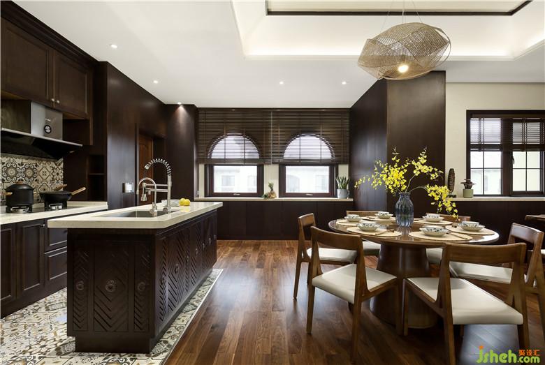 餐廳開放式空間以質(zhì)樸溫馨的中性色彩為主,采用實(shí)木的餐桌、座椅,純天然的材質(zhì)散發(fā)出自然的氣息。在裝飾品局部的細(xì)節(jié)上點(diǎn)綴鮮艷的黃色蝴蝶蘭自然溫馨中又帶著明快和熱情,這也是整個(gè)家給人的印象,沉靜與熱情并存。中西廚并兼,考慮到后期使用,室內(nèi)設(shè)計(jì)師運(yùn)用了小花磚的背景墻與地面,在整個(gè)空間中格外引人矚目??罩刑倬幍鯚艉筒妥酪涡纬闪撕魬?yīng),自然、古樸。