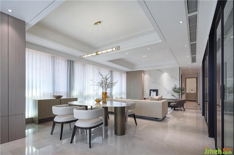 設(shè)計(jì)師關(guān)注軟裝細(xì)節(jié)的連續(xù)性,以此凸顯視覺延展的意趣?;⌒螏r板餐桌搭配白色圍合式皮紋餐椅,橘棕色玻璃花器點(diǎn)綴其中,木色餐柜與墻面色彩呼應(yīng)。大平層裝修設(shè)計(jì)圓筒狀吊燈灑下柔和的光線,簡(jiǎn)潔的色彩,多層次的材質(zhì)串聯(lián)起一日三餐的儀式感。