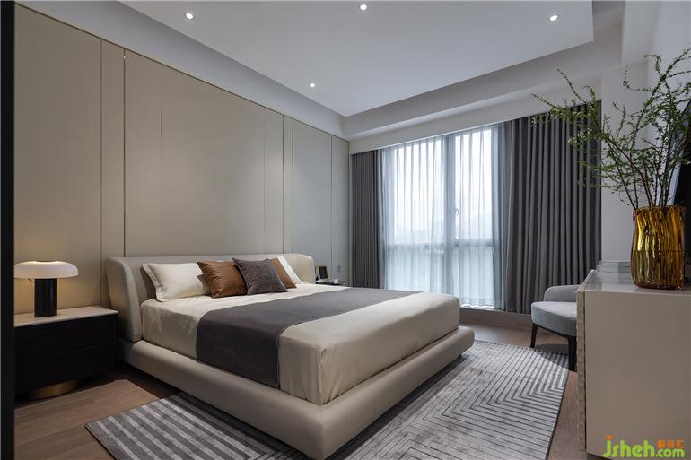 一處美好的居所就像一幕精心排演的話劇,訴說著主人對(duì)生活的熱愛以及對(duì)家人的關(guān)照。在這個(gè)精神與身體歸屬的空間里,呈現(xiàn)生活的本質(zhì)。主臥以簡(jiǎn)約、雅致為基調(diào),大平層裝修設(shè)計(jì)在L型布局的套房設(shè)計(jì)中嵌入步入式衣柜,有效利用空間。半圍合式弧形床頭,搭配白色蘑菇燈,點(diǎn)亮溫柔的夜色,為主人的安眠營(yíng)造一份靜謐和安全感。