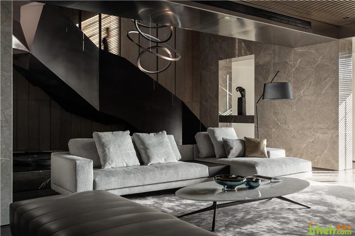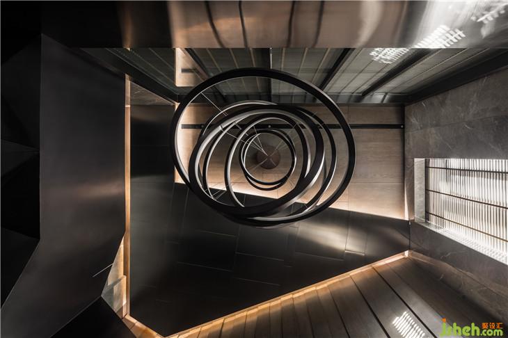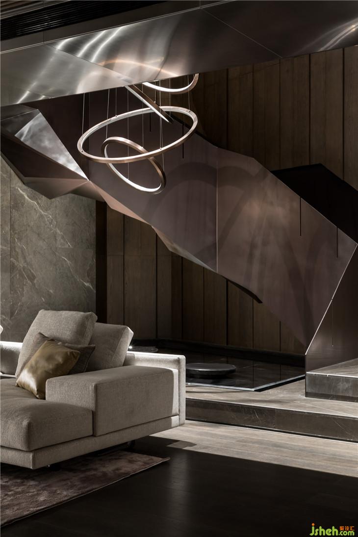 在整體空間最吸引人的空間元素,則是超大雕塑性質(zhì)的垂直動線,挑空的高度及折面的梯面形成了一個雕塑性、藝術(shù)感非常強烈的區(qū)域轉(zhuǎn)換了全空間最重要的角落,不僅具備了樓梯提供動線的基本功能同時形成了藝術(shù)品的呈現(xiàn)。座落在景觀水池之上,讓空間更有特色。