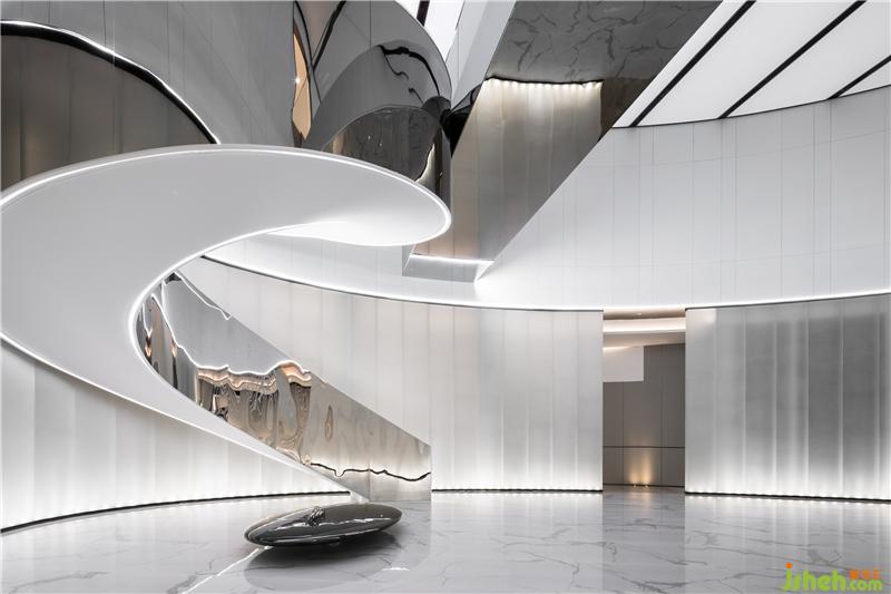 在入口空間,設(shè)計師以「穿透介質(zhì),模糊空間邊界」為架構(gòu),由一樓天方地圓的形式展開,打破既有軸線的安排,利用弧線型的動線活躍空間的體驗感。室內(nèi)設(shè)計師