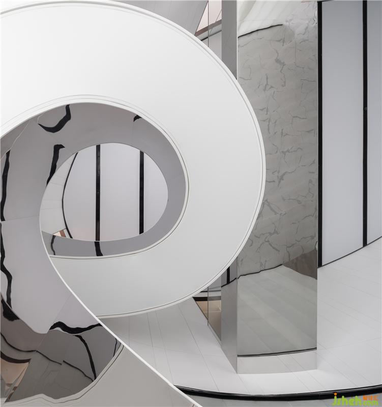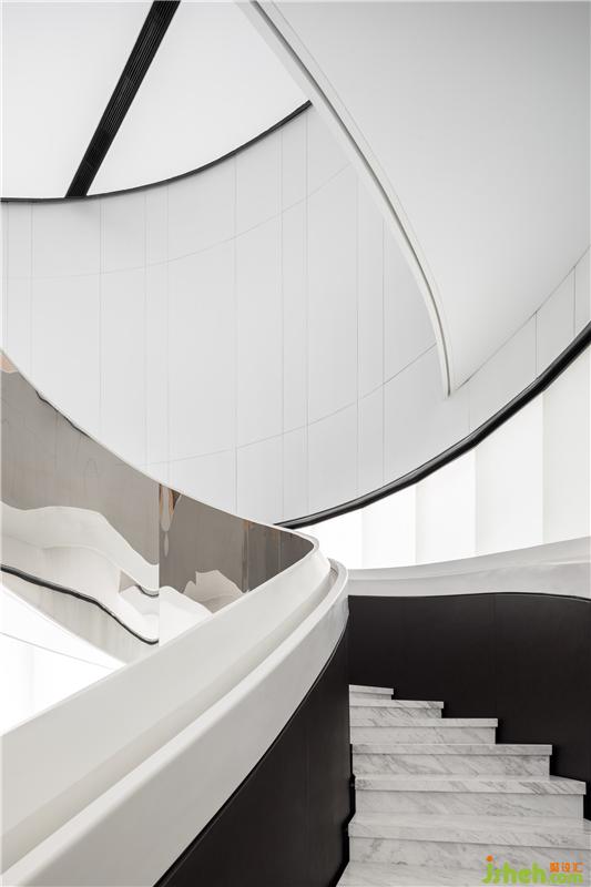螺旋反射的結(jié)構(gòu)體模糊既定樓梯的剛直生硬印象,又透過(guò)象征合流的曲線角度,引景入室。室內(nèi)設(shè)計(jì)師