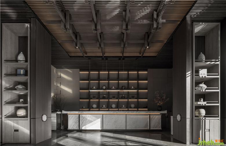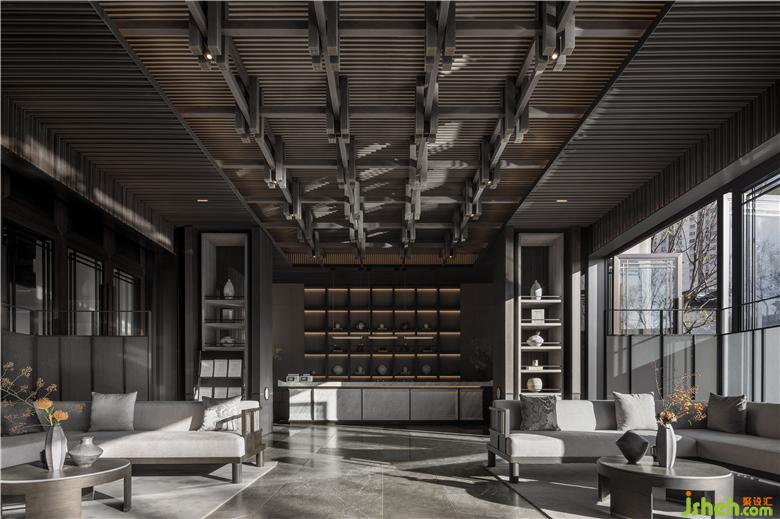 天花木結(jié)構(gòu)采用傳統(tǒng)的“榫卯”序列,上下層級的疊合關(guān)系,陰陽相合,明暗相成,既是建筑中的藝術(shù),也同時傳達(dá)著東方的哲學(xué)內(nèi)蘊。接待區(qū)空間布置提煉于五代·顧閎中的《韓熙載夜宴圖》,透過屏風(fēng)、沙發(fā)、長案的自由組合,形成賓主得當(dāng),疏密有致禮儀空間,運用傳統(tǒng)東方的畫屏,形成空間的界定,讓整體的視線與內(nèi)庭外園形成空間的聯(lián)結(jié),傳達(dá)東方文雅精致的精神內(nèi)涵。