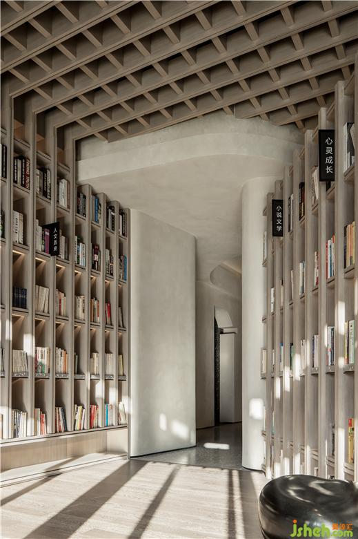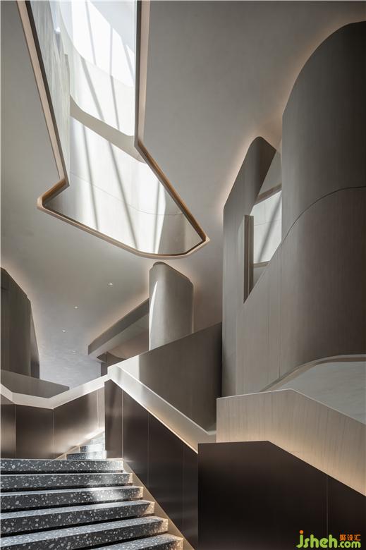 室內(nèi)設(shè)計(jì)貫穿了折面與弧線的型態(tài),以體塊分明的形式處理,結(jié)合局部開槽、疊加、牽引的設(shè)計(jì)手法,讓建筑體態(tài)在空間中自然的伸展。在整體的空間基調(diào)上,光照而折射的建筑塊體跟隨著折面的線條進(jìn)行延展,同時營造出具有現(xiàn)代極簡和未來消隱的不同感受,形容為「城市山谷的」氣場,未來…幽靜深遠(yuǎn)。峽谷間應(yīng)型而就溪流以及峽谷間翻流沖突的煙霞風(fēng)云仿佛要掙脫峽谷型體界定的桎梏,思考呈現(xiàn)冷靜、舒適的空間感受,視覺效果上大方,相互結(jié)合營造出屬于建筑的生命力與深度。
