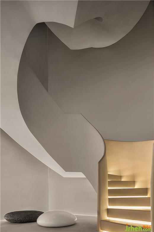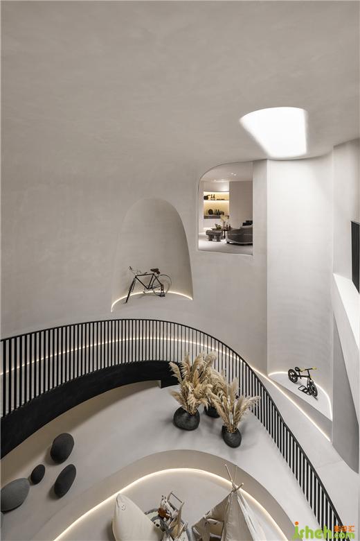 垂直動(dòng)線(xiàn)樓梯與主臥更衣間的天花板造型,增加中式建筑屋頂-盝頂?shù)木€(xiàn)條,樣板間設(shè)計(jì)延續(xù)首層利用現(xiàn)代極簡(jiǎn)線(xiàn)條呈現(xiàn)中式傳統(tǒng)語(yǔ)匯,創(chuàng)造出扶搖直上的空間寓意,二層廊道空間增加開(kāi)放展示柜體,利用不同厚度的立板,實(shí)體與虛體的層板,增加柜體的張力及視覺(jué)的探索,也讓長(zhǎng)形的廊道增加視覺(jué)層次,不再只是剎那間經(jīng)過(guò)的過(guò)度空間,是可以短暫停留觀賞的展示空間。