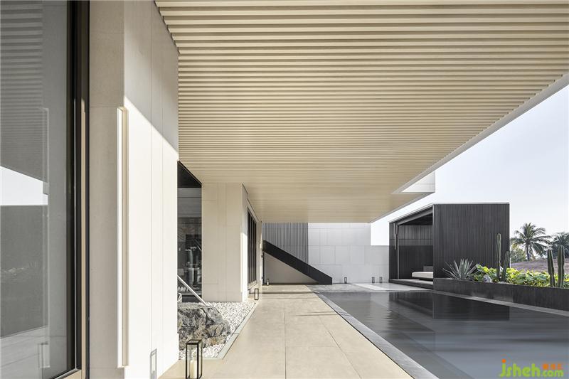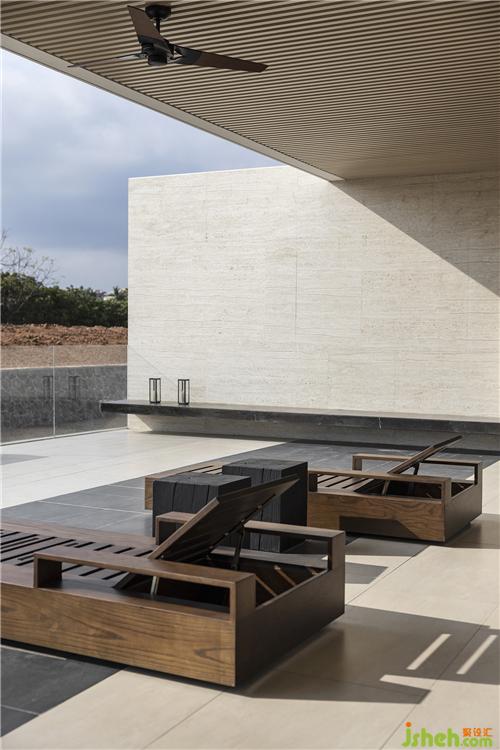 從茶室穿越到戶外泳池,賓客用餐舉辦派對的同時,可享有前后兩端不同的景觀河水潺潺流動的聲音,乘著風穿過泳池流進耳里,后方茶室靜謐的氛圍,光線被樹葉打散灑落在地面上,映著最深沉的石紋。