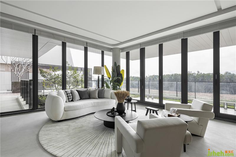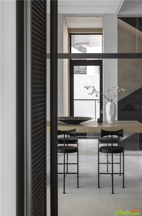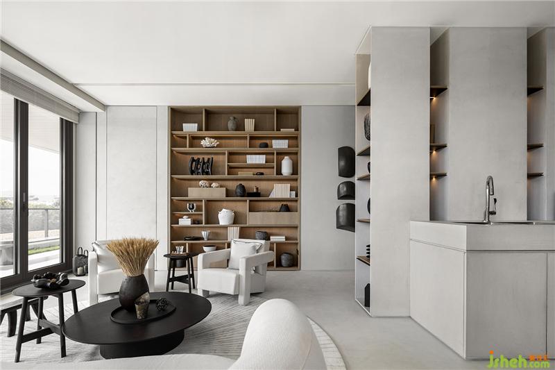 設(shè)計(jì)師刻意僅使用兩種材料搭配,別于地下一層社交空間的熱鬧感受,讓心情沉淀,轉(zhuǎn)為平穩(wěn)的內(nèi)心釋放;三亞樣板房設(shè)計(jì)量體彼此實(shí)虛交疊,在光影的變換下,客廳中島演變?yōu)橐患笮偷袼?,讓一層空間圍繞著中島,圍繞著家人彼此的歡愉交流與生活動(dòng)線(xiàn)。