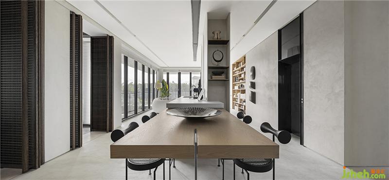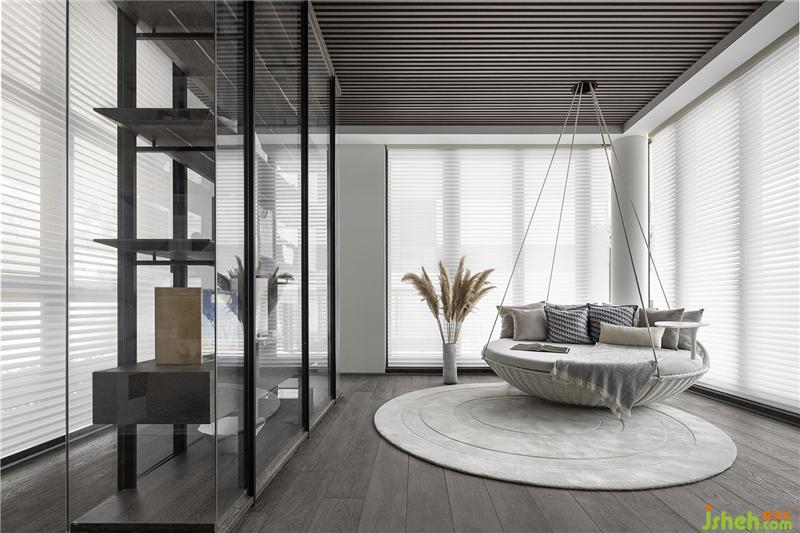 陽(yáng)光景致引入室內(nèi)的多功能房,使用大量的木飾面增加自然溫暖的氛圍,搭配著淺白色的圓形吊床,度假感受儼然成形,家人及閨密在此交流生活趣事。偶爾女主人演奏雙簧管的樂(lè)聲透過(guò)木格柵門(mén)扇,流溢至客廳中;透明玻璃柜里擺放著家人的珍藏藝品,如同發(fā)光的寶盒般的展示。