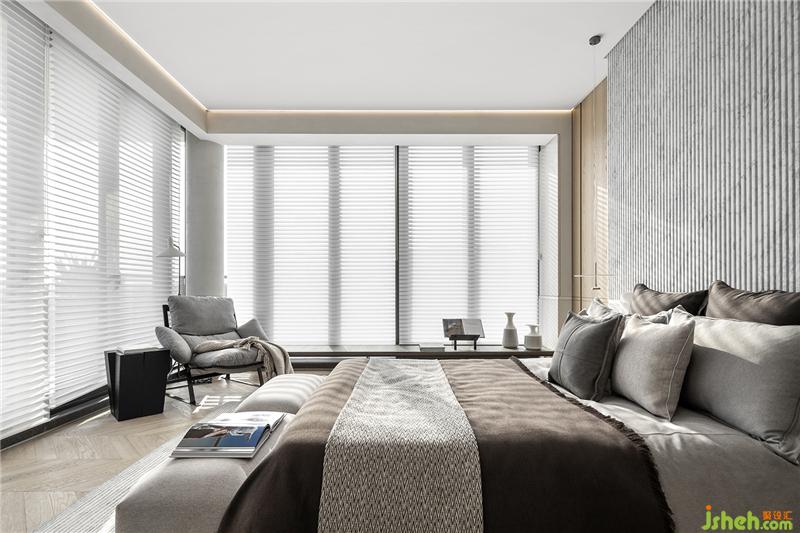 床頭背墻使用魚(yú)肚白格柵,搭配整室的石材腰線(xiàn),抓出壁面比例,沉穩(wěn)色調(diào)的床具,讓睡眠及休憩成為臥房中的主角。