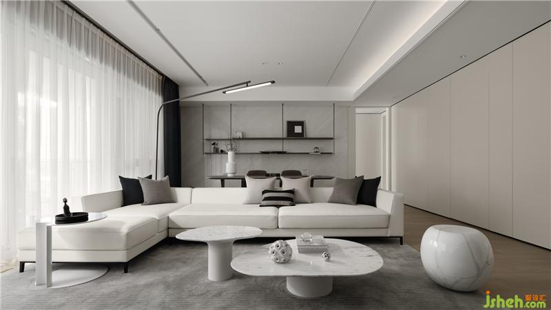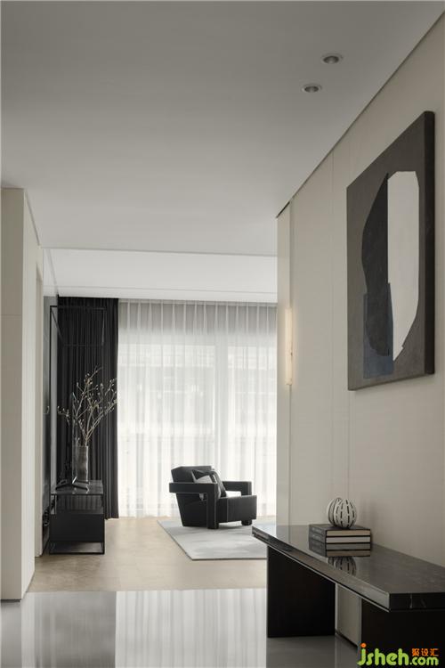 以局部鐵件裝飾,利用局部鍍鈦的點(diǎn)綴深色元素,??跇影宸吭O(shè)計(jì)平衡空間的重量與色彩,軸線延伸、通透的設(shè)計(jì)。