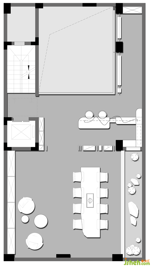 在夾層區(qū)域設(shè)置冥想?yún)^(qū),當(dāng)車水馬龍、摩肩擦踵成為城市的代名詞,當(dāng)快節(jié)奏的步調(diào)成為生活常態(tài),載浮載沉在忙碌且日復(fù)一日的時間洪流。配合室內(nèi)天井,垂直向度的連結(jié),沒有喧囂浮躁,取而代之是一片靜謐與安寧。