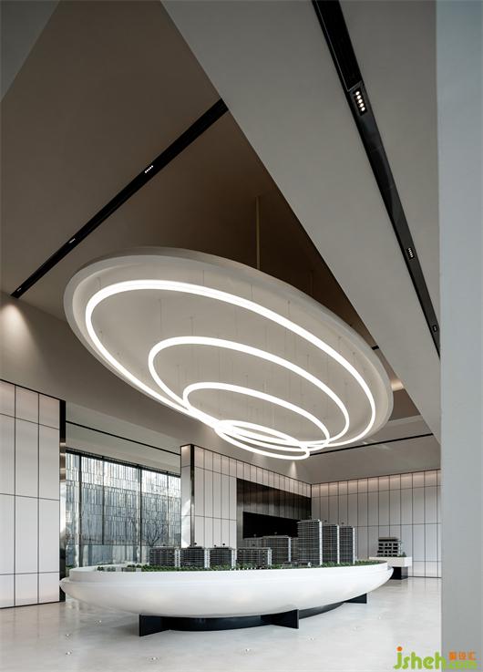 沙盤(pán)與天花裝置由浮空島嶼演變而成,上下合圍的體塊與室外的山水畫(huà)境對(duì)應(yīng),通過(guò)仿若巨幅畫(huà)框的幕墻進(jìn)行融合轉(zhuǎn)換,又歸于盡頭,兩兩相對(duì)。