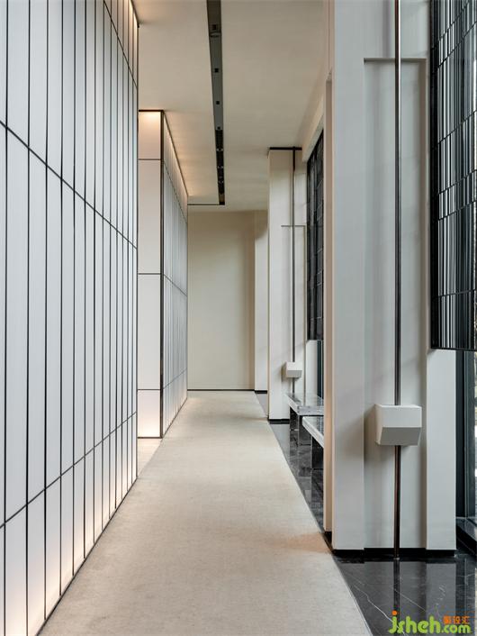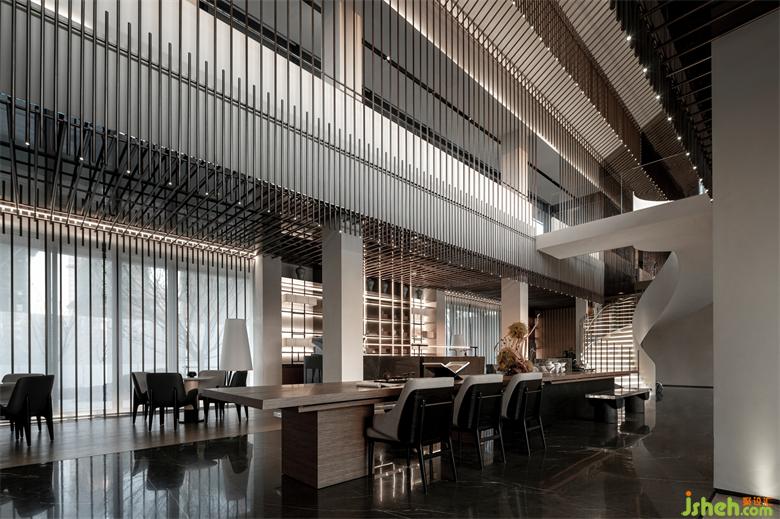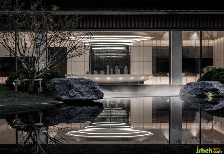 會(huì)所設(shè)計(jì)水景構(gòu)成的鏡面,倒映著清雋的樹(shù)枝與建筑。地面與墻面同時(shí)向外延伸,環(huán)境和室內(nèi)總有著某種融通,通過(guò)材質(zhì)作爲(wèi)媒介,空間被最大限度地打開(kāi)交互。