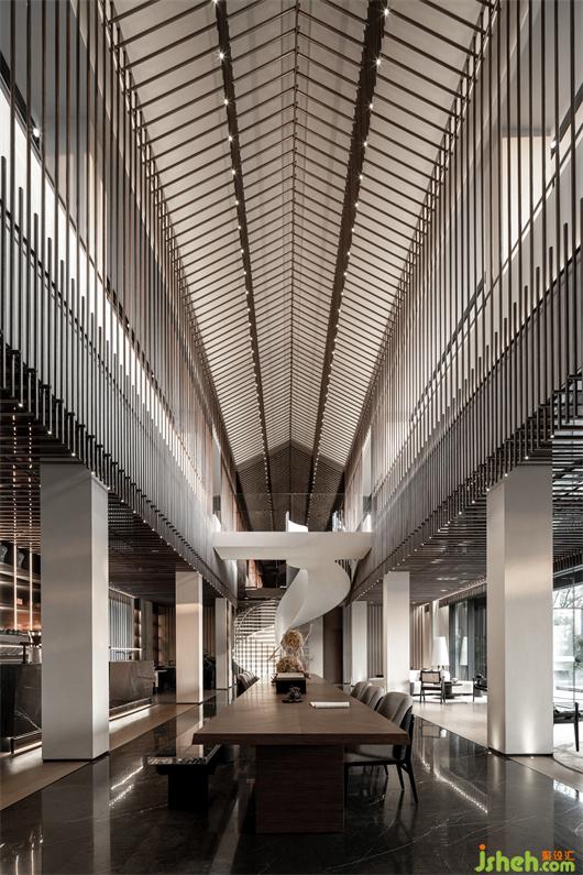 會(huì)所設(shè)計(jì)借由宋代“落地明造”的落地格子窗的概念。室內(nèi)與室外空間最大的融合