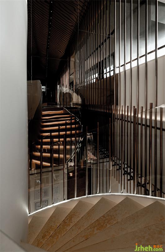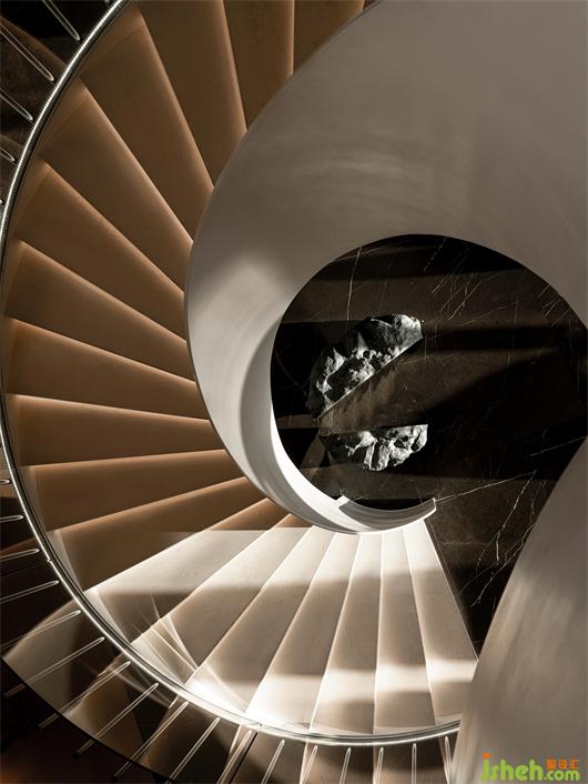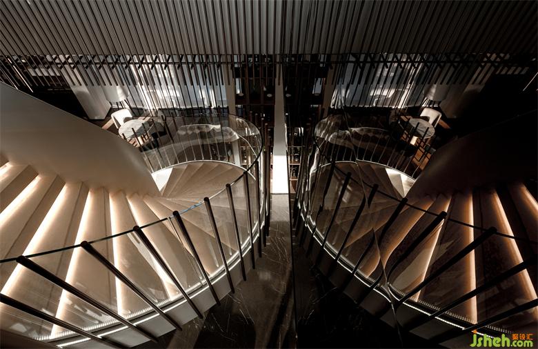 站在空間中心處,以洽談長桌爲中軸、藝術樓梯爲核心??梢韵騼蓚€分支張望,讓游者自然的就順著光和景觀,愉悅地徜徉其中。