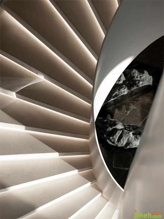 連接二層VIP室的樓梯是壹個小小的轉(zhuǎn)場,從鸚鵡螺獲取靈感來源,黃金比例的結構分割。會所設計更像從天而降的大型藝術裝置,轉(zhuǎn)軸式的視線吸引,瞬間將前廳的克制推遠。淡泊甯靜的暖灰色調(diào),是壹個再進入的起點。與尖銳的大塊面金屬天花、陣列格柵,在強烈線條感的空間對峙中找尋平衡,實現(xiàn)空間情緒的深沈進入。