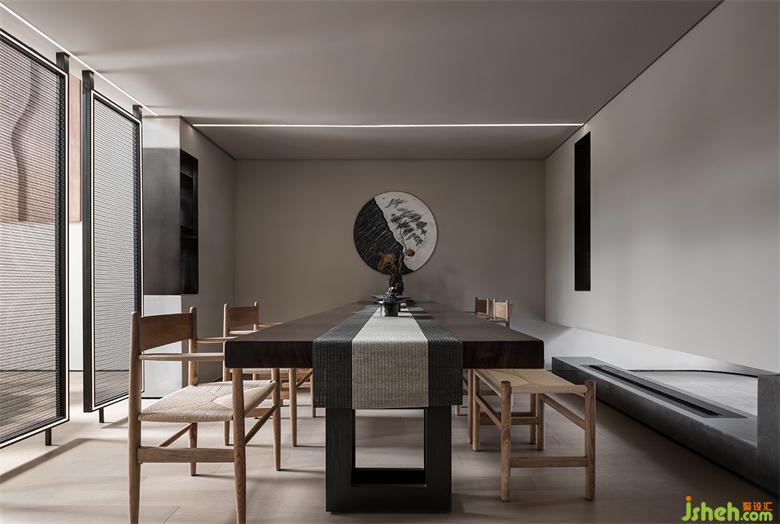 前廳的島臺與水吧臺透過墻體穿插連續(xù)在一起,“天際線”的光線延續(xù)了空間,將彼此牽引在一起。武漢會所設(shè)計平滑細膩黑鈦不銹鋼與富有肌理感的微水泥塑造沉靜感的異形空間,溫潤的木皮與冰冷的石材裝裱空間的張馳華麗。
